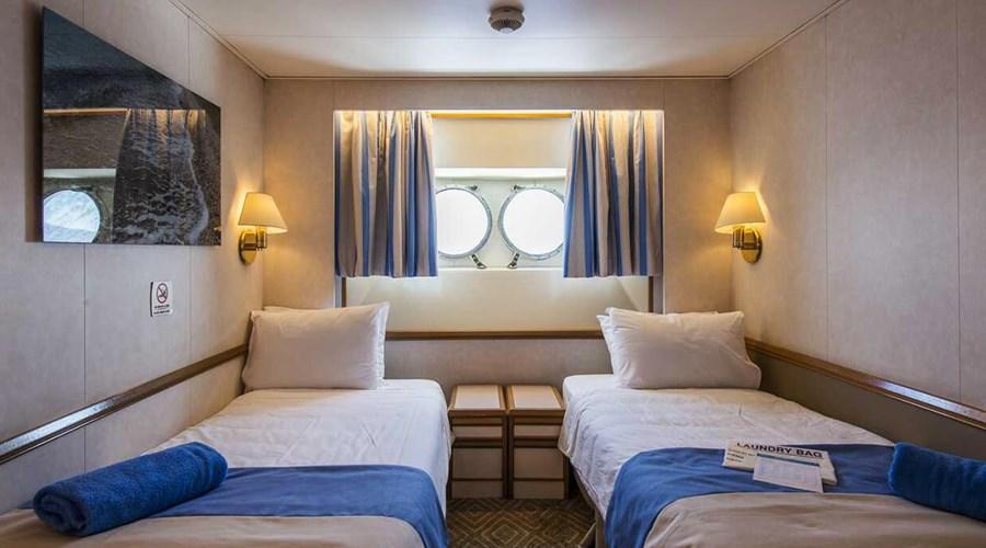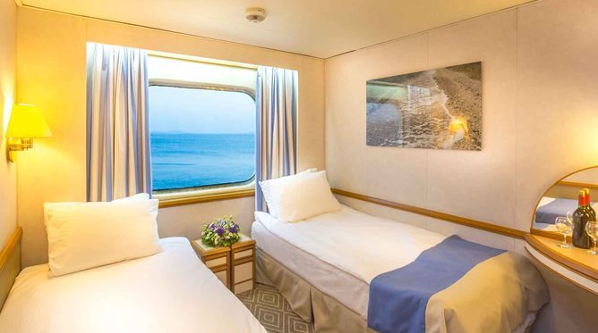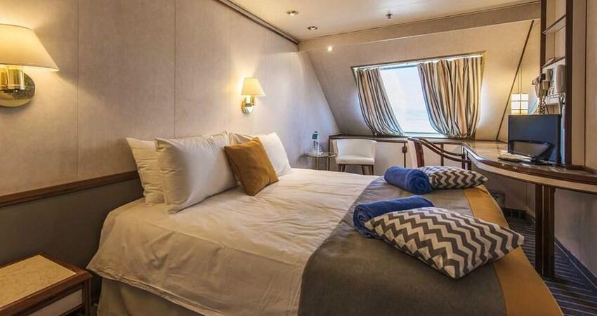 (CAT5) Superior Dış Kabin (Kısmi Görüşlü) : 4 maksimum misafir. 6. Superior Kısmi Manzara Güvertede Dış Kabinler yaklaşık 13m² olup pencere, klima, TV, telefon, kasa, duş/WC ve saç kurutma makinesi ile donatılmıştır. Tüm kabinlerde birleştirilebilir iki ayrı yatak bulunmaktadır. Bazı kabinlerde 3. ve 4. kişilerin konaklaması için ranza bulunmaktadır. Pencereler kısmen görünür.