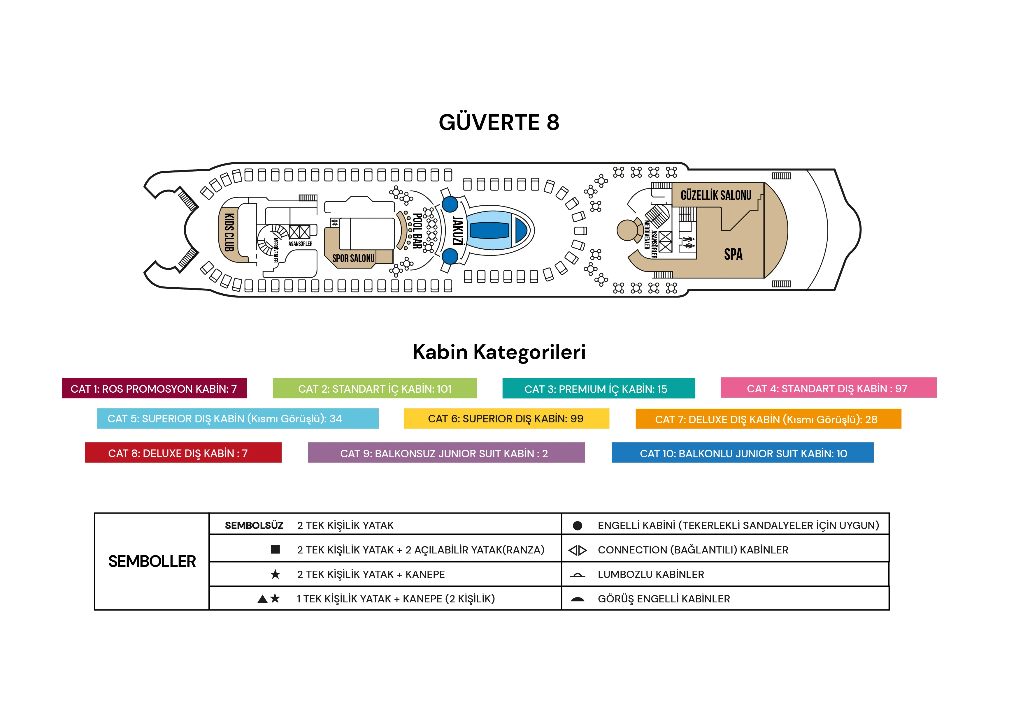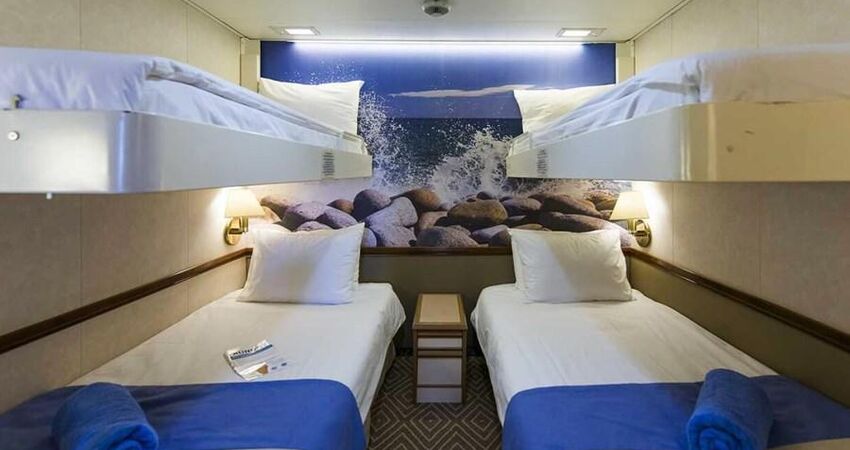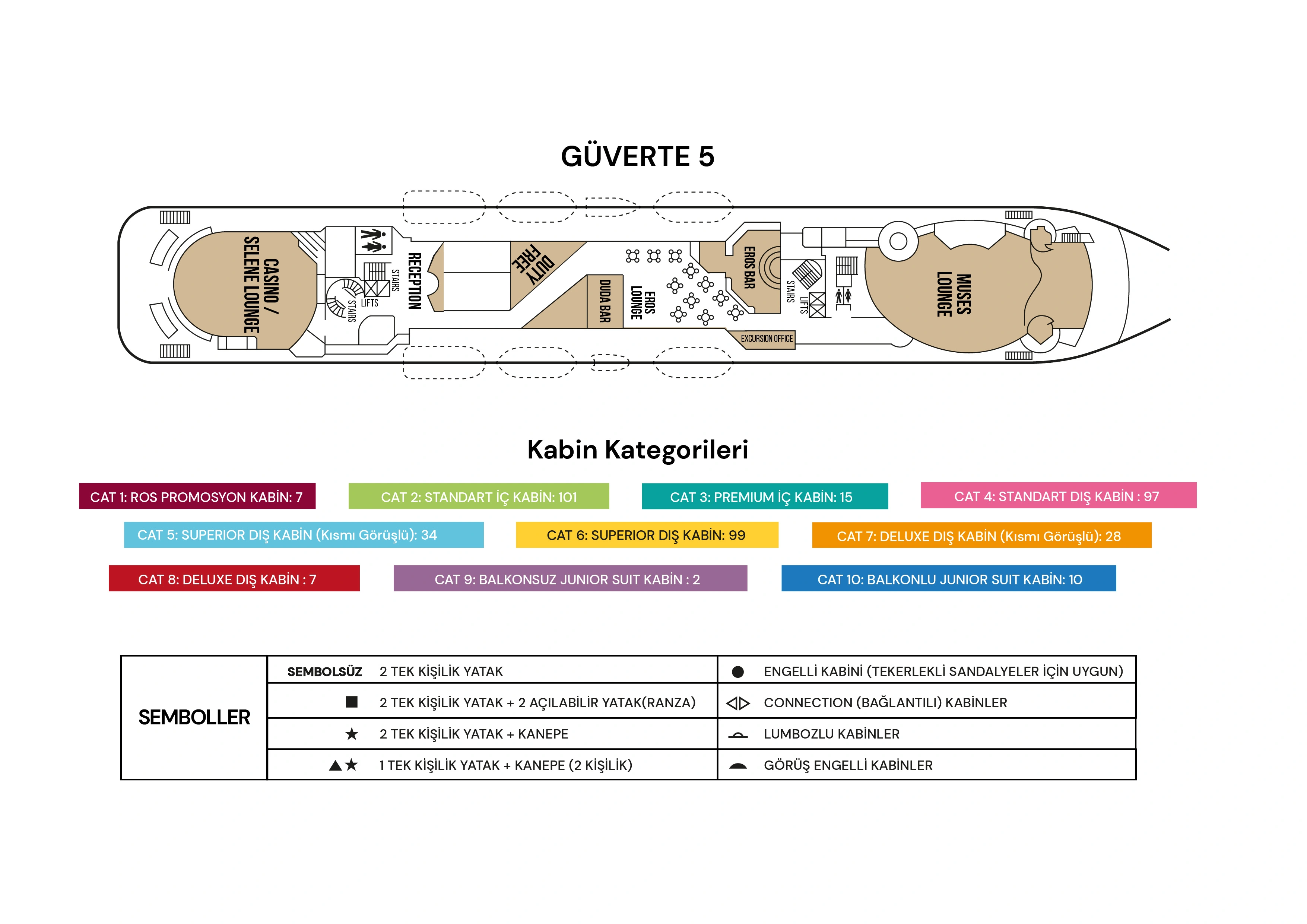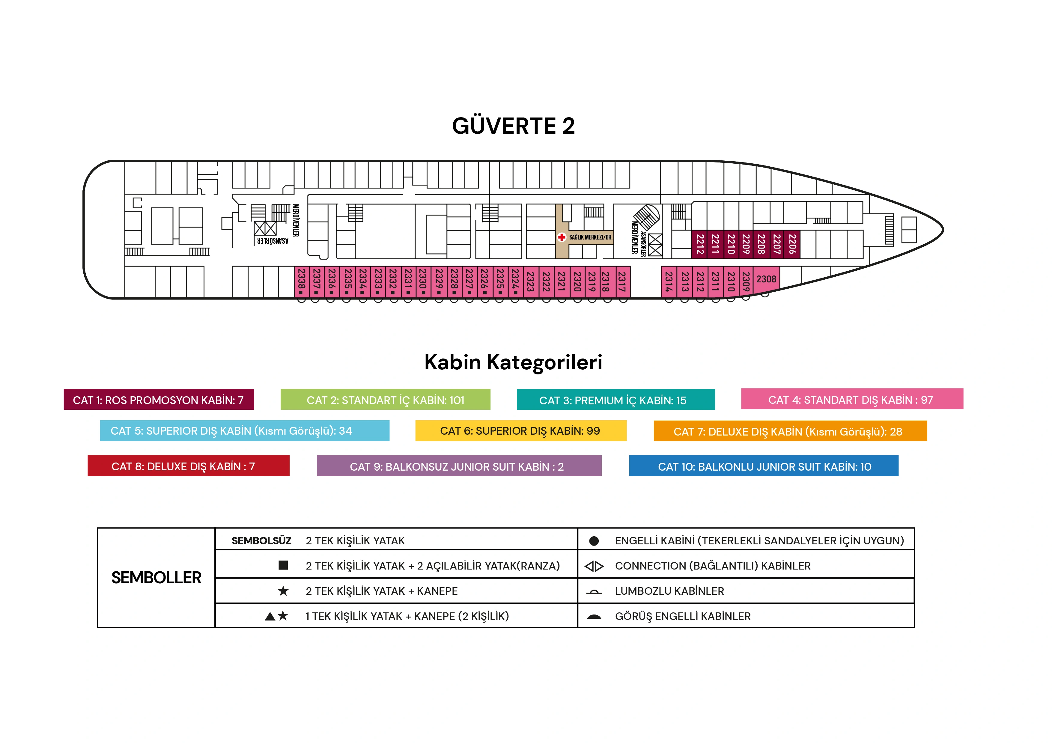 CAT1) Ros Kabin : 2 maksimum misafir. 2. Güvertede bulunan Promosyon Kabinler yaklaşık 12m² olup klima, TV, telefon, kasa, duş/WC ve saç kurutma makinesi ile donatılmıştır. Tüm kabinlerde birleştirilebilir iki ayrı yatak bulunmaktadır.