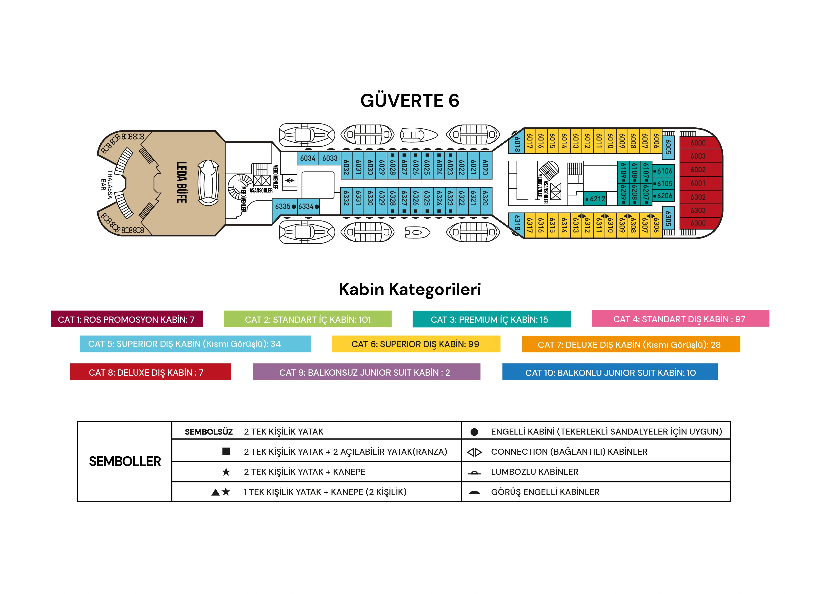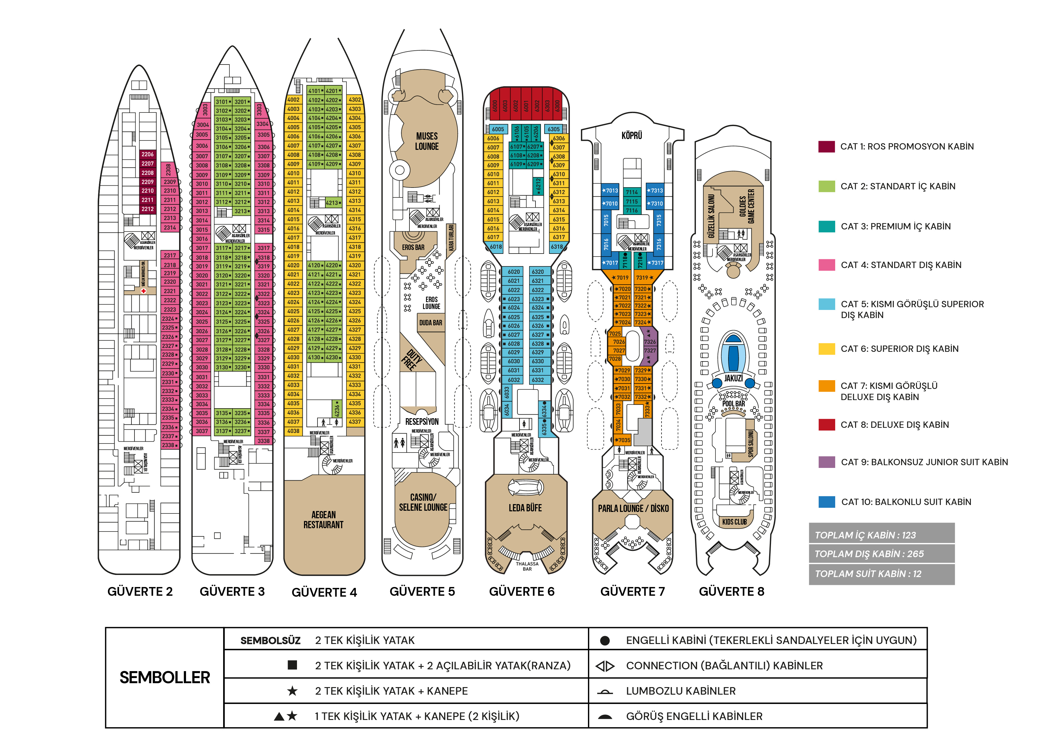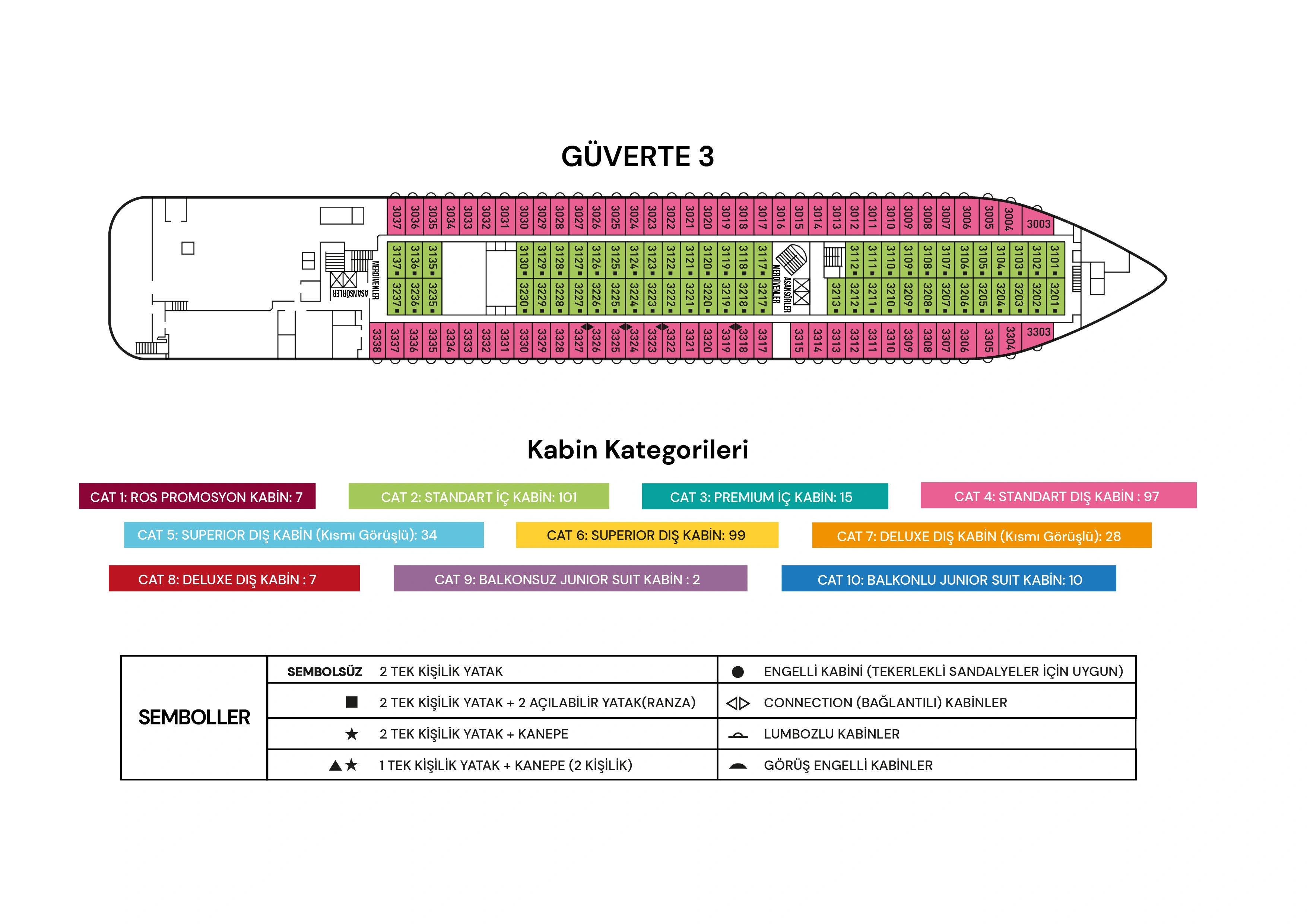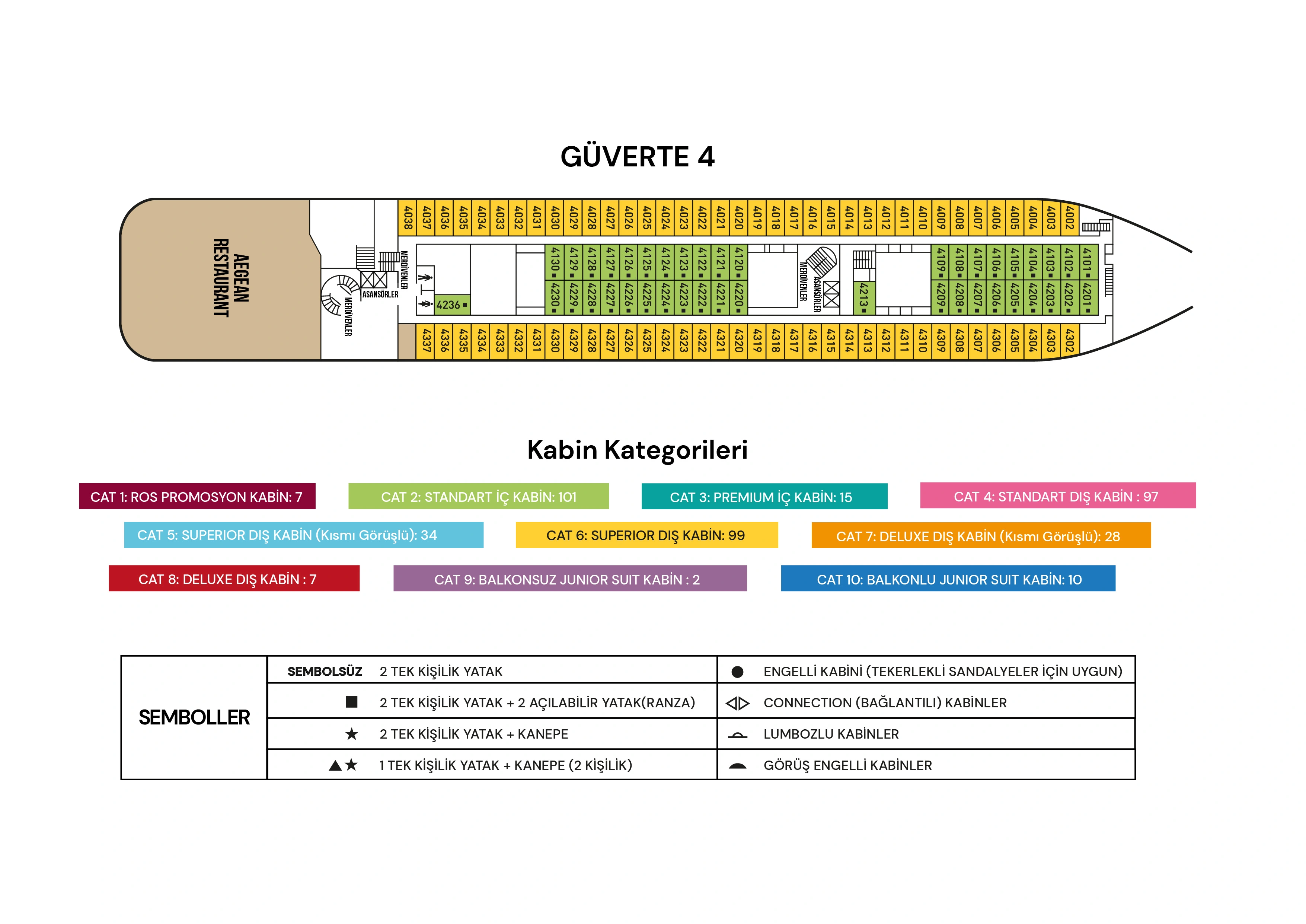 CAT1) Ros Kabin : 2 maksimum misafir. 2. Güvertede bulunan Promosyon Kabinler yaklaşık 12m² olup klima, TV, telefon, kasa, duş/WC ve saç kurutma makinesi ile donatılmıştır. Tüm kabinlerde birleştirilebilir iki ayrı yatak bulunmaktadır.
