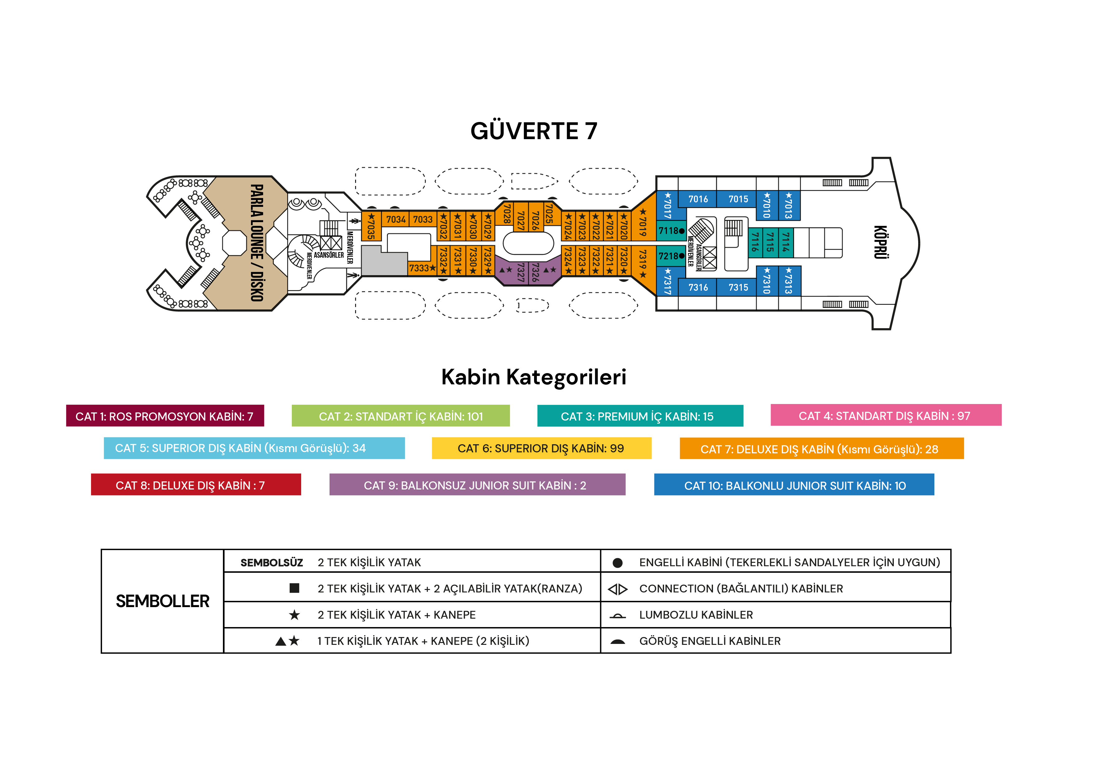 (CAT9) Junior Suit Kabin : Maksimum 3 misafir. 7. Güvertede Junior Suitler yaklaşık 24m² olup pencereler, minibar, klima, TV, telefon, kasa, duş/WC ve saç kurutma makinesi ile donatılmıştır. Tüm kabinlerde iki ayrı yatak ve birleştirilebilir bir çift kişilik çekyat bulunmaktadır.